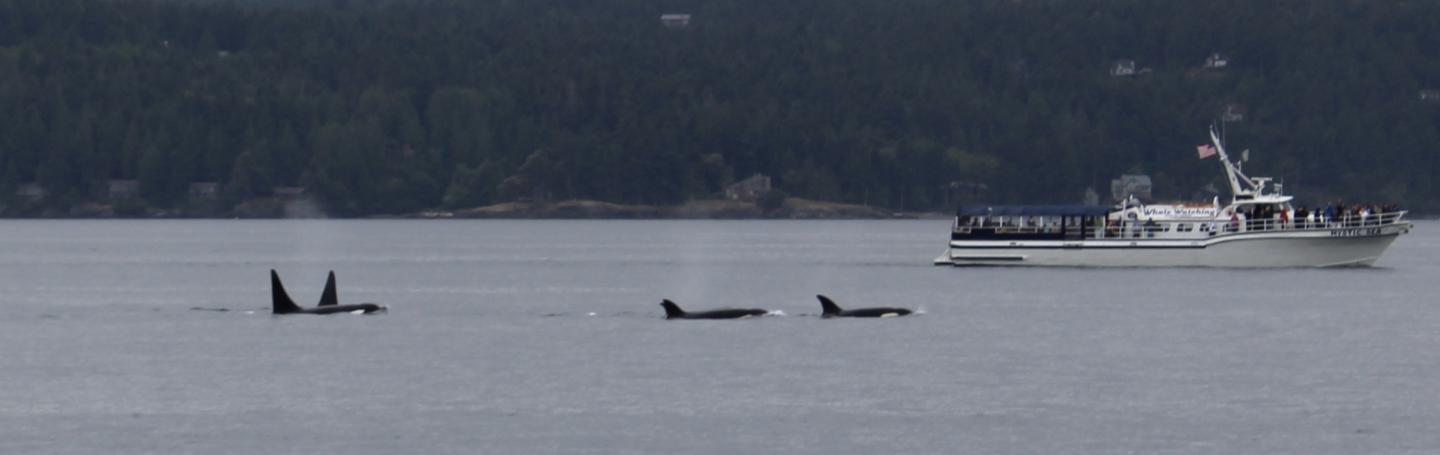 Heading north we passed Shaw Island then Yellow and O’Neal as we approached the north end of San Juan Island and Spieden Channel. In the distance, through the mist, we started to see other puffs of mist! “Spsshh, Spshh” a group of Orcas almost floated in the distance. Their dark dorsal fins cut through the intermingling calm waters and foggy sky. We approached this group slowly as they headed south and we north. It was multiple families of Transients traveling together. It was the T65A’s and the T123’s. Orcas travel in matrilineal family groups and researchers give each individual whale an ID code. They use T’s for Transients and other letters for other ecotypes, and each family is named after the matriarch (the oldest female in the group usual the mother to most of the other orcas in the group). T65A has four children and most of them are still pretty young and super adorable! T123 has two children, and one of them, T123A is an adult male so he’s a little easier to spot with his 6-foot tall dorsal fin.