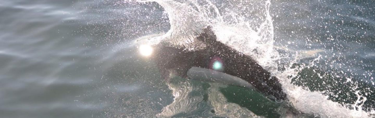 By the time we rounded Stuart island, we got a report of Dall's porpoise in Haro Straight, and raced off to find them. These are the fastest marine mammals in the world, able to reach up to 36 miles per hour. They're also very well-known for a behavior called bow-riding, in which they'll take advantage of the pressure wave generated in front of a fast-moving boat, and are able to move incredibly fast without exerting almost any energy at all. This is observed in a few different species of dolphins and porpoises, but is always a treat to observe. just minutes after we arrived on scene, the Dall's bee-lined for our moving vessel and in a flash were moving along just feet below us on the bow wave. There are a few different theories as to why they do this, but the one that seems to make the most sense is for sheer playful enjoyment. All I know for sure is that guests (myself included) enjoyed watching.