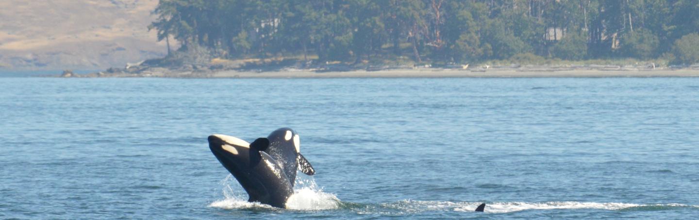 WOW. WOW OH WOW. I'm not even sure how to start describing today's trip. It my hands down my best trip of the season. We cruised out of Roche Harbor and immediately encountered a group of 9 transient killer whales. One adult male (T49C) seemed to be trying to start a party--or something. He was tail slapping non-stop. No one else appeared to want anything to do with it. It actually looked as if he was throwing a bit of a hissy fit. Then finally the part started. Two young calves, probably both under the age of 5, started chasing a bird. They porpoised in circles as the poor water-logged auklet tried to fly away. I'm not sure of the conclusion. THEN one of those little guys started breaching. He/she breached 5 times consecutively before the second one finally caved and went in for a double breach (pictured). They followed that behavior up with a moon walk. This is a rare behavior where the whale swims backward.