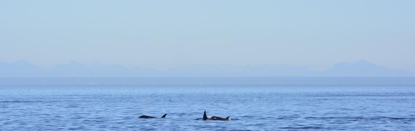 We were watching them swim throughout the water when suddenly they disappeared! A few minutes passed till they reappeared a few yards from our boat and headed straight towards us! Everyone got very excited as they came closer and closer with their big black bodies emerging from the water. You could see the six-foot-tall dorsal fins shaking in the wind as the two big males passed by, led by mom. The whales headed further up the Strait of Georgia as we followed respectfully alongside them. But then, suddenly, we saw two more orca whales appear out of nowhere! Occasionally, we’ll see this interaction between different pods of orcas as they either socialize, communicate or mate with each other. It was amazing to see that in action.