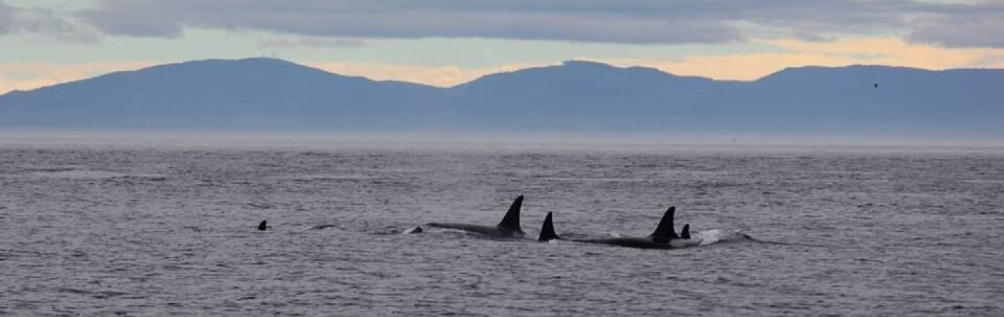 Shortly after seeing the harbor seals, we saw the first sign of an orca: tall dorsal fins up at the water's surface. There were orcas travelling north up San Juan Channel, passing right by Roche Harbor. It was hard to see what they were up to at first, but we could tell that there were many animals in the area. After getting some better views and seeing a white/gray calf, we could identify the pod as the T46B's. They are a group of transient, or Bigg's killer whales, that have 8 whales in their pod! Two of the 8 whales are brand new calves, one that was born in 2018 and one that was born this year! The matriarch of the pod, T46B, is a whale who is 31 years old. With her newest calf this year, she has now had 6 offspring! Her eldest daughter, T46B1, has now had two calves of her own! She is 16 years old. Her newest calf is the white/gray whale. He has leucism, which means that he is lacking pigmentation. It was incredible to see this pod altogether, and there were a few times that all 8 of them were up at the surface together! Throughout the encounter, they began to pick up speed and swim in circles, so it seemed possible that they were hunting something. We eventually had to say goodbye to the T46B's to search for other wildlife in the area.